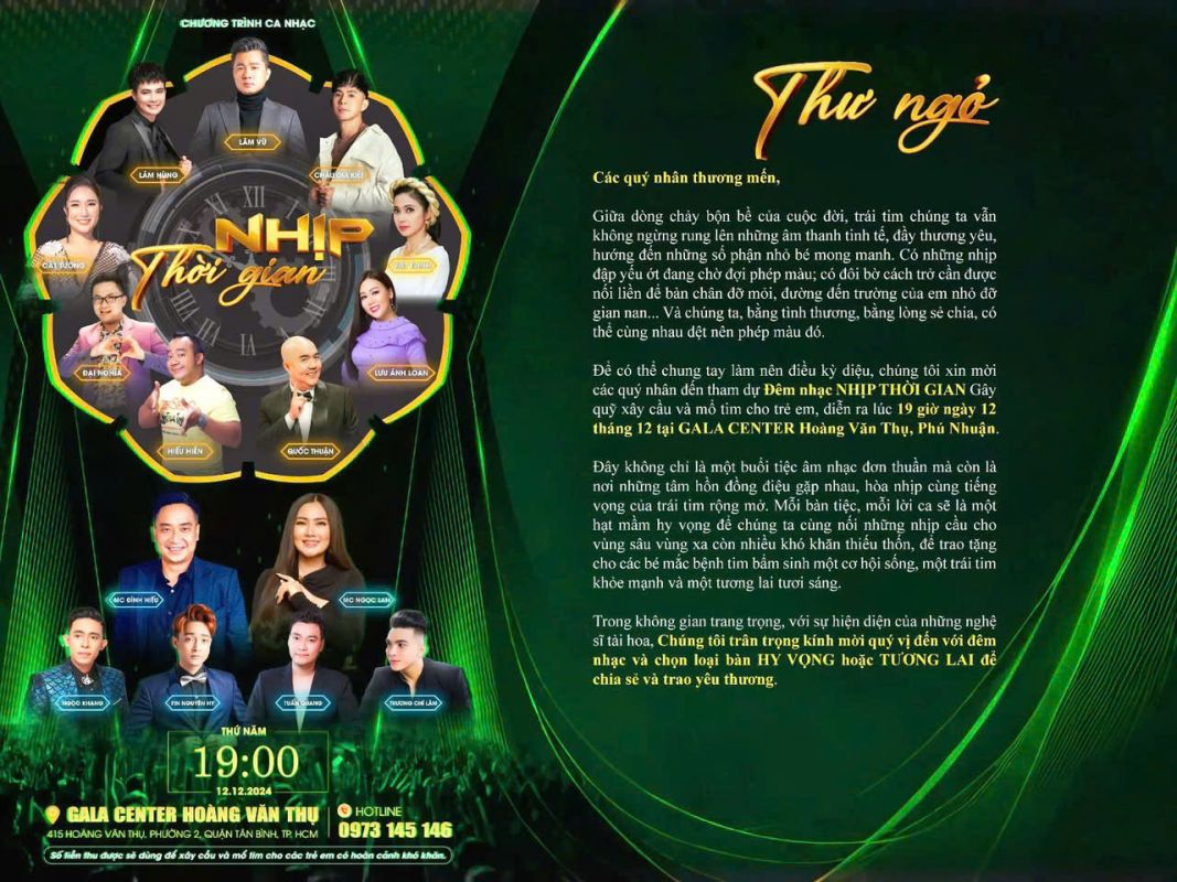 Trong không gian sang trọng, với sự hiện diện của những nghệ sĩ tài hoa đang được mến mộ, chúng tôi rất mong có sự hiện diện đông đảo của quý vị quan khách và lựa chọn loại bàn: Hy vọng hoặc Tương lai để sẻ chia và trao yêu thương! Sự chung tay với ban tổ chức của quý vị sẽ giúp những mục đích thiết thực nên trên sớm hiện thực hóa để bà con nghèo và trẻ em bệnh tim sớm được hòa nhập với cuộc sống , không ai bỏ lại phía sau và nhịp thời gian là không chờ đợi!”.